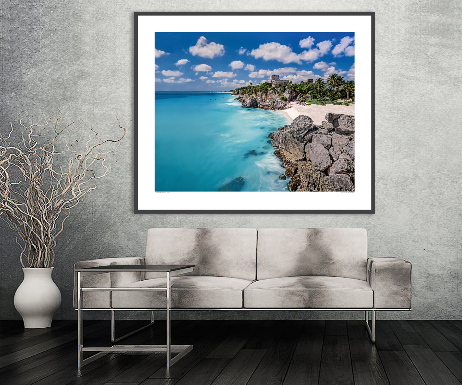 Standing on a cliff, carved out by the Caribbean Sea stands the famous Mayan city of Tulum, protected on three sides by a thick wall. To the east is the dazzling turquoise sea.